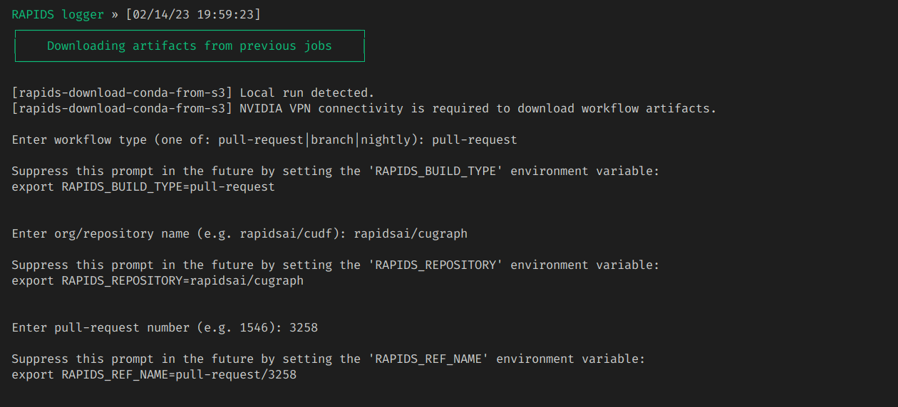 Any time the rapids-download-conda-from-s3 command (e.g. here) is encountered in a local test run, the user will be prompted for any necessary environment variables that are missing.